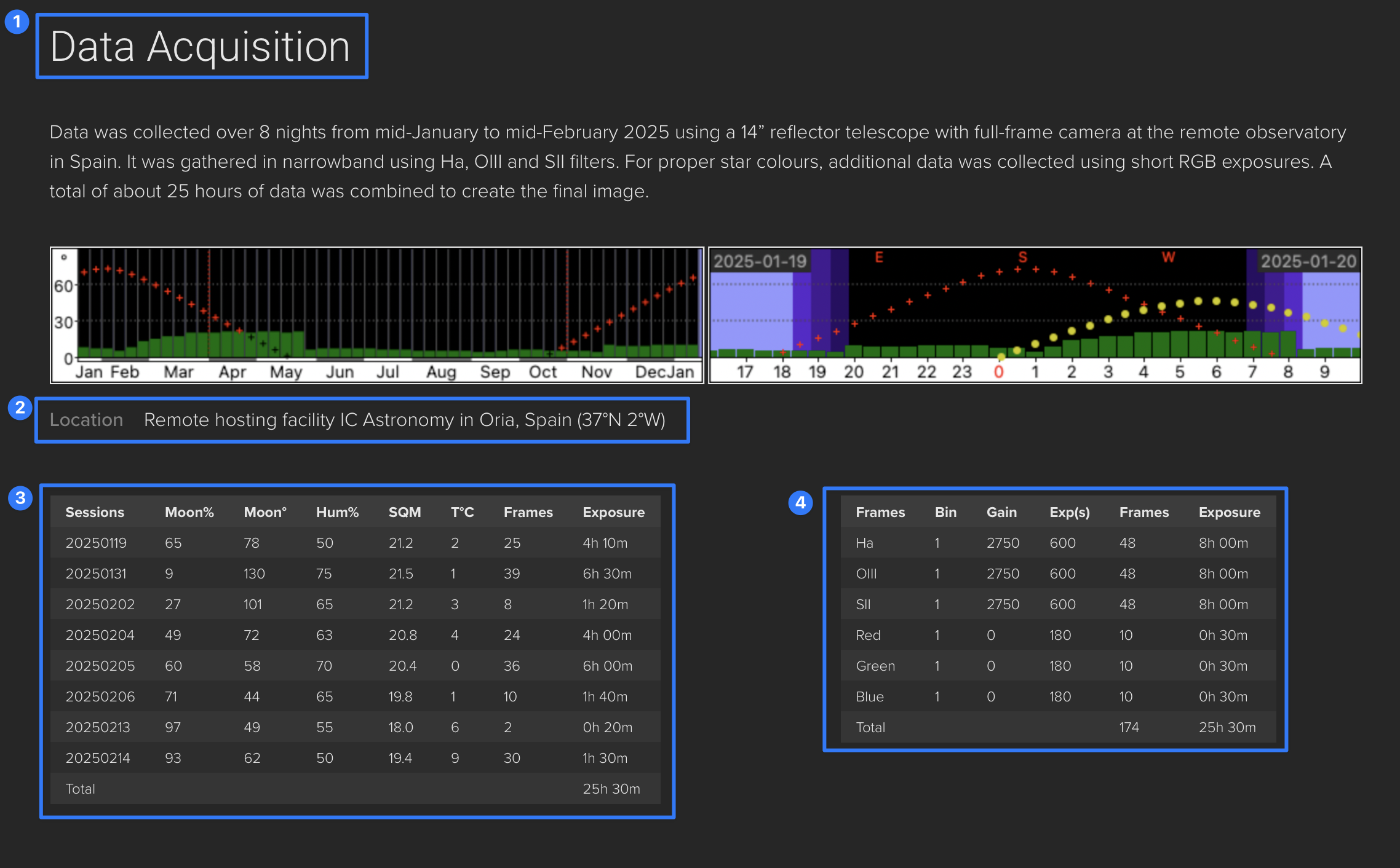 On the AstroWorldCreations website, each deep sky image has its own page filled with details. This includes information about the object, imaging conditions, equipment used, and a step-by-step description of the processing. The layout of these pages has changed several times over the years, often adding more information but shifting focus away from the image itself. I have now updated the layout to make the image the main focus again.