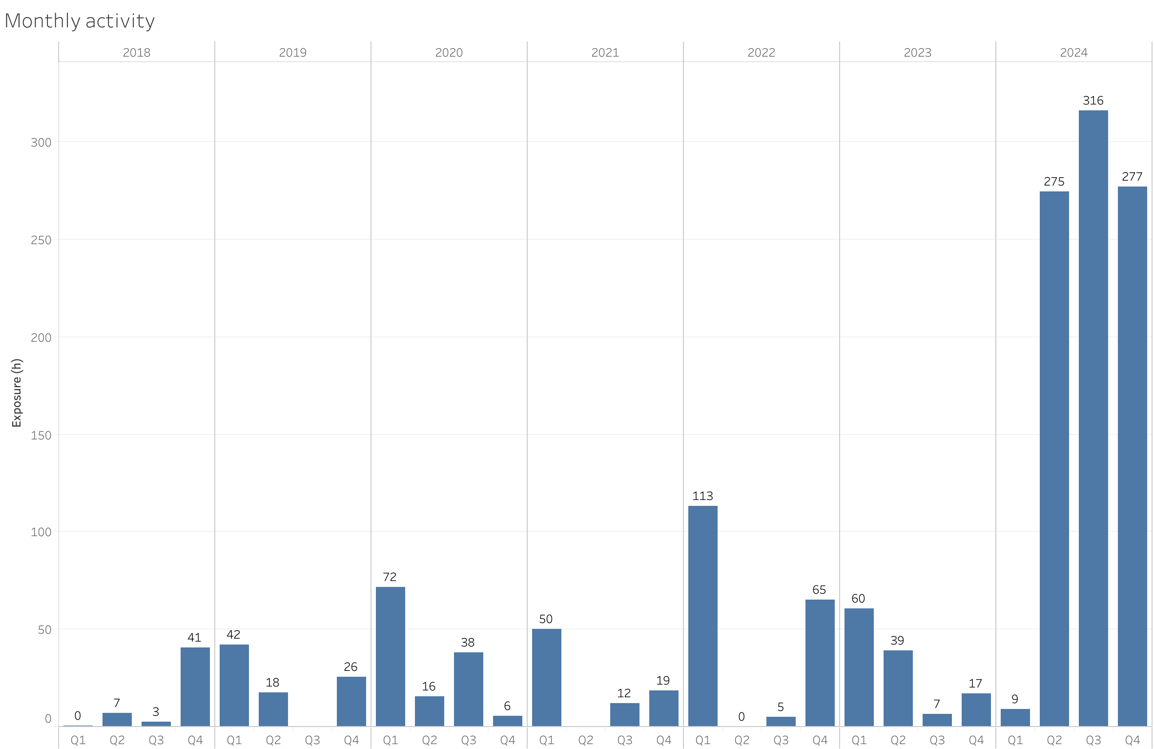 Total exposure time per quarter from the start of my astrophotography journey in 2018. The remote observatory caused an almost 10-fold increase in exposure hours.